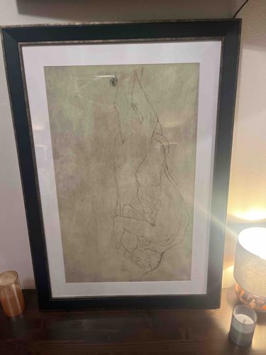This item is a large-format reproduction print of an erotica sketch by the Austrian Symbolist painter Gustav Klimt, likely titled 'Two Female Figures Seated' or a similar study from his later career. The work features Klimt's signature fluid, continuous line drawing style in graphite-like tones against a muted, parchment-style background with subtle hints of green and pink pastel hues. The print is housed behind glass in a modern, gallery-style frame. The frame consists of a wide black wooden molding with a thin inner silver or pewter-toned bevel, providing a sophisticated Art Deco-inspired aesthetic. A thick, white acid-free mat creates a clean border around the artwork, emphasizing its vertical orientation. Physically, the piece appears to be in excellent contemporary condition with no visible foxing, tearing, or sun-fading on the paper surface. The frame shows tight mitered corners and a well-maintained finish with no significant scuffing or chipping. While based on a work from the early 20th century (circa 1910-1918), this specific physical object is a high-quality modern commercial print. The craftsmanship of the framing suggests it was professionally assembled for residential or office decor, prioritizing clarity and minimalist elegance to match the modernist sensibilities of Klimt’s sketches.