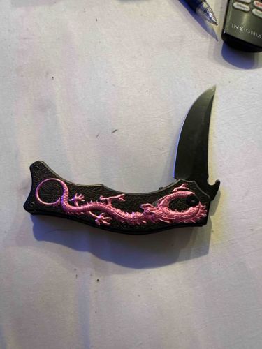 This is a contemporary folding pocket knife featuring a distinctive curved handle and blade design. The handle is constructed from a matte black textured synthetic or powder-coated metal, adorned with a highly detailed, relief-carved Eastern-style dragon motif finished in a metallic pink or fuchsia color. The dragon spans the entire length of the grip, providing both aesthetic flair and additional surface texture for handling. The blade is a dark, possibly black-oxide coated steel, featuring a hawkbill or trailing point curvature with a sharp tip and a smooth edge. It includes a thumb stud or flipper tab at the base of the blade for manual or spring-assisted opening. The construction appears to be held together by Torx-head screws, typical of modern mass-produced tactical or novelty knives. Condition-wise, the item shows minor signs of use, including some slight scuffing on the black finish of the blade and handle scales, though the pink metallic plating remains vibrant. This item is representative of 21st-century 'mall ninja' or novelty tactical folding knives, prioritize decorative appeal over high-end metallurgy or professional utility.