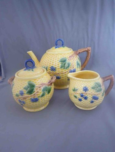 This is a three-piece ceramic tea service consisting of a teapot with a lid, a double-handled lidded sugar bowl, and a cream pitcher. The set is characterized by a distinctive 'basketweave' or 'lattice' relief texture across the yellow bodies, overlaid with a botanical motif featuring molded ripe blackberries in blue, green leaves, and brown woody stems. The handles on all pieces are fashioned to resemble gnarled branches, while the lids of the teapot and sugar bowl feature a unique blue coiled or rope-style ring finial. The interior of the pitcher reveals a smooth cream glaze. Although specific maker's marks are not visible in the photo, the set corresponds to the high-quality majolica-style earthenware produced for or by Tiffany & Co., likely dating from the mid-to-late 20th century. The craftsmanship is evident in the detailed relief work and the hand-painted application of the glazes. The condition appears to be excellent with no visible chips or cracks. The colors remain vibrant, and the glaze presents a consistent lustrous finish without significant crazing.