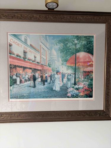 This is a large, landscape-oriented framed art print depicting a vibrant street scene outside the 'Cadet de Gascogne' restaurant in the Montmartre district of Paris, with the Sacré-Cœur Basilica visible in the background. The artwork is rendered in an Impressionistic style, characterized by soft brushwork and a pastel-leaning color palette featuring salmon pinks, soft greens, and cool blues. The composition shows a bustling cobblestone terrace populated with figures in turn-of-the-century attire, including a prominent central figure of a woman in a white dress. A large red umbrella dominates the right foreground near a flower stall. The print is professionally mounted behind glass with a double mat; the inner mat is a thin salmon-pink accent, while the outer mat is a wide, neutral grey. The frame is a substantial, dark bronze-toned wood or composite with ornate decorative scrollwork and floral relief patterns along the entire perimeter. The piece appears to be a late 20th-century decorative reproduction. The condition appears excellent with no visible foxing on the paper or fading in the pigments. The frame shows minor surface dust but no significant chips or cracks. An LED picture light is mounted above the frame, which is not part of the artwork itself.