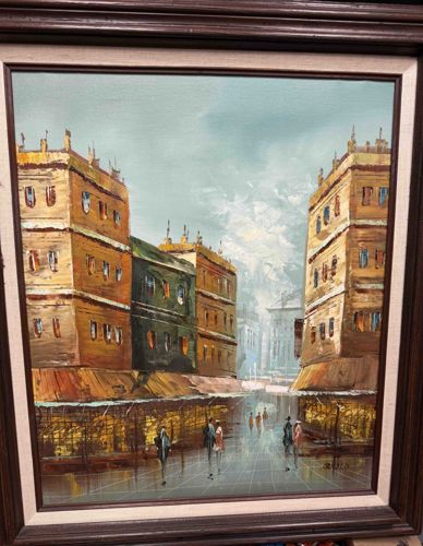 This item is an original oil painting depicting a bustling cityscape, likely Parisian, rendered with a distinctive impasto technique. The artwork is housed within a dark brown wooden frame with a subtle carved pattern, and an off-white linen or fabric liner. The painting itself showcases tall, multi-story buildings with rows of windows, predominantly in warm terracotta and amber tones, with a central building having darker green-grey hues. The perspective suggests a street or boulevard leading into the distance, with faint architectural details visible in the background under a pale, somewhat overcast sky. The foreground features several stylized figures, possibly pedestrians, rendered with minimal detail but conveying a sense of movement and urban activity. The wet-street effect, with reflections of the buildings and lights, adds depth and atmosphere. The thick application of paint (impasto) is visible throughout, especially in the building facades and the sky, creating texture and a tactile quality. The color palette primarily includes blues, greys, browns, oranges, and muted greens, with pops of white and lighter tones in the sky and reflections. A signature, possibly 'F. Nardona' or similar, appears in the lower right corner, though it is somewhat difficult to decipher from the image. The overall style is expressive and semi-abstract, characteristic of mid-20th century to contemporary street scene paintings. The frame appears to be in good condition, and the painting itself shows no immediately visible signs of damage, such as cracks, chips, or significant discoloration, maintaining its original vibrancy and texture. The craftsmanship indicates a commercial art piece, offering decorative appeal.