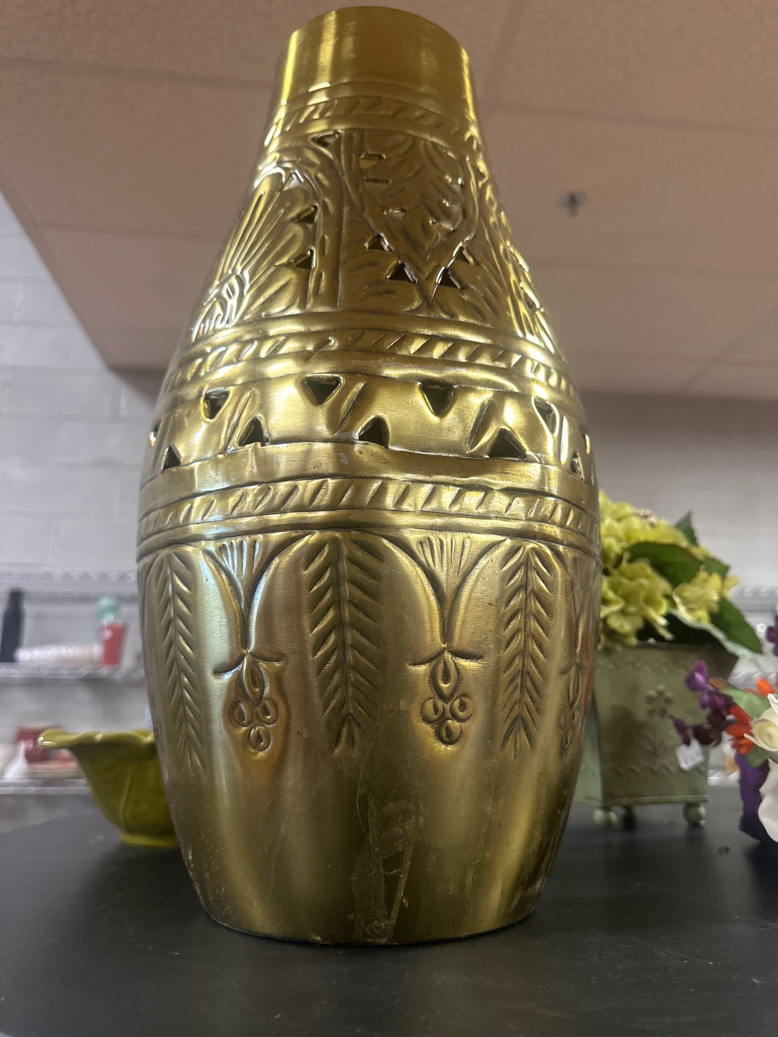 Vintage Pierced and Etched Brass Ovoid Vase