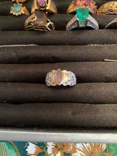 This is a contemporary fashion ring featuring a central marquise-cut cabochon stone, likely a pale pink quartz, opalite, or mother-of-pearl, exhibiting a soft, milky luster. The stone is set in a low-profile bezel or partial bezel within a two-tone metal mounting. The immediate border around the central stone appears to be yellow gold or gold-plated metal, which provides a warm contrast to the primary band. The shank and shoulders are crafted from a silver-toned metal, possibly sterling silver or white gold-plated brass, and are elaborately adorned. The shoulders feature a wide, textured design encrusted with numerous small, round-cut clear accents, likely cubic zirconia or marcasite, arranged in a pav style. This gives the ring a shimmering, vintage-inspired aesthetic. The overall construction is substantial for its size, suggesting a cast metal technique. Regarding condition, the metal surfaces show minor signs of wear and surface scratches consistent with use. The stones appear secure, though the brilliance of the accent stones may be slightly dulled by dust or film. No hallmark or maker’s mark is clearly visible in the image, but the style is indicative of late 20th-century to early 2000s costume or bridge jewelry manufacturing. The craftsmanship reflects mass-produced quality with a focus on decorative visual appeal.