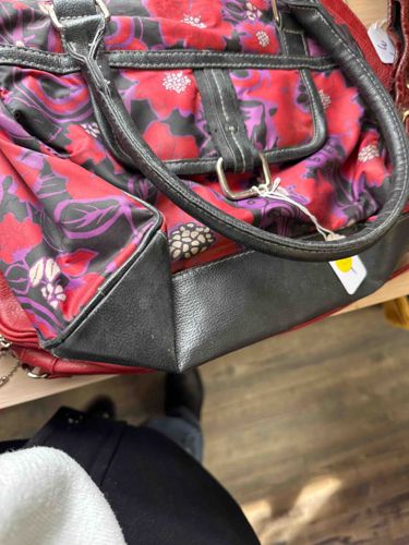 This is a medium-sized fashion satchel featuring a vibrant floral print body and contrasting black base and trim. The primary fabric is a printed synthetic textile, likely polyester or nylon, displaying large-scale abstract floral motifs in shades of crimson red, magenta, and deep purple set against a black background. The construction includes a wide, reinforced black polyurethane (faux leather) base with structured corners and dual rolled top handles attached via silver-tone metal D-rings. A noteworthy design element is the central vertical strap with white contrast stitching that threads through a rectangular metal buckle on the front face. The stitching throughout appears to be machine-made with standard commercial quality. Regarding condition, there is visible surface wear and scuffing on the black synthetic base and piping. The fabric portion shows some creasing and slight softening of the internal structure, suggesting moderate prior use. No prominent brand labels or maker's marks are visible on the exterior, though a retail price tag is attached, indicating it is likely a mass-market contemporary accessory from the 2010s era. The overall craftsmanship is consistent with fast-fashion accessories intended for casual everyday use.