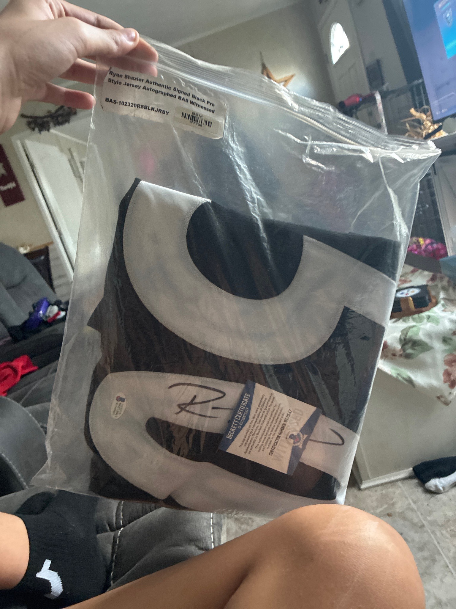 This is a Ryan Shazier autographed black 'Pro Style' jersey, specifically designed for athletic memorabilia markets. The item features the iconic black and white color scheme associated with the Pittsburgh Steelers. The jersey is professionally signed by former NFL linebacker Ryan Shazier in black ink, featuring a clear and bold signature on the white tackle-twill numeral '5'. The garment is housed in its original clear plastic protective packaging to preserve its condition. A critical value-add is the visible Beckett Authentication Services (BAS) Witnessed certification. The physical jersey includes a BAS holographic tamper-evident sticker attached directly to the fabric (serial number WE71547) and is accompanied by a matching Beckett Certificate of Authenticity (COA) card tucked inside the bag. A white inventory label on the exterior of the bag identifies the item as 'Ryan Shazier Authentic Signed Black Pro Style Jersey Autographed BAS Witnessed' with the SKU BAS-102320RSBLKJRSY. The jersey appears to be in mint, unworn condition with no visible signs of fading, staining, or fabric pulls. As a 'Pro Style' jersey, it is high-quality for display purposes but serves as a representative garment rather than an on-field game-worn piece. The presence of third-party witnessed authentication significantly boosts its provenance and marketability for sports collectors.