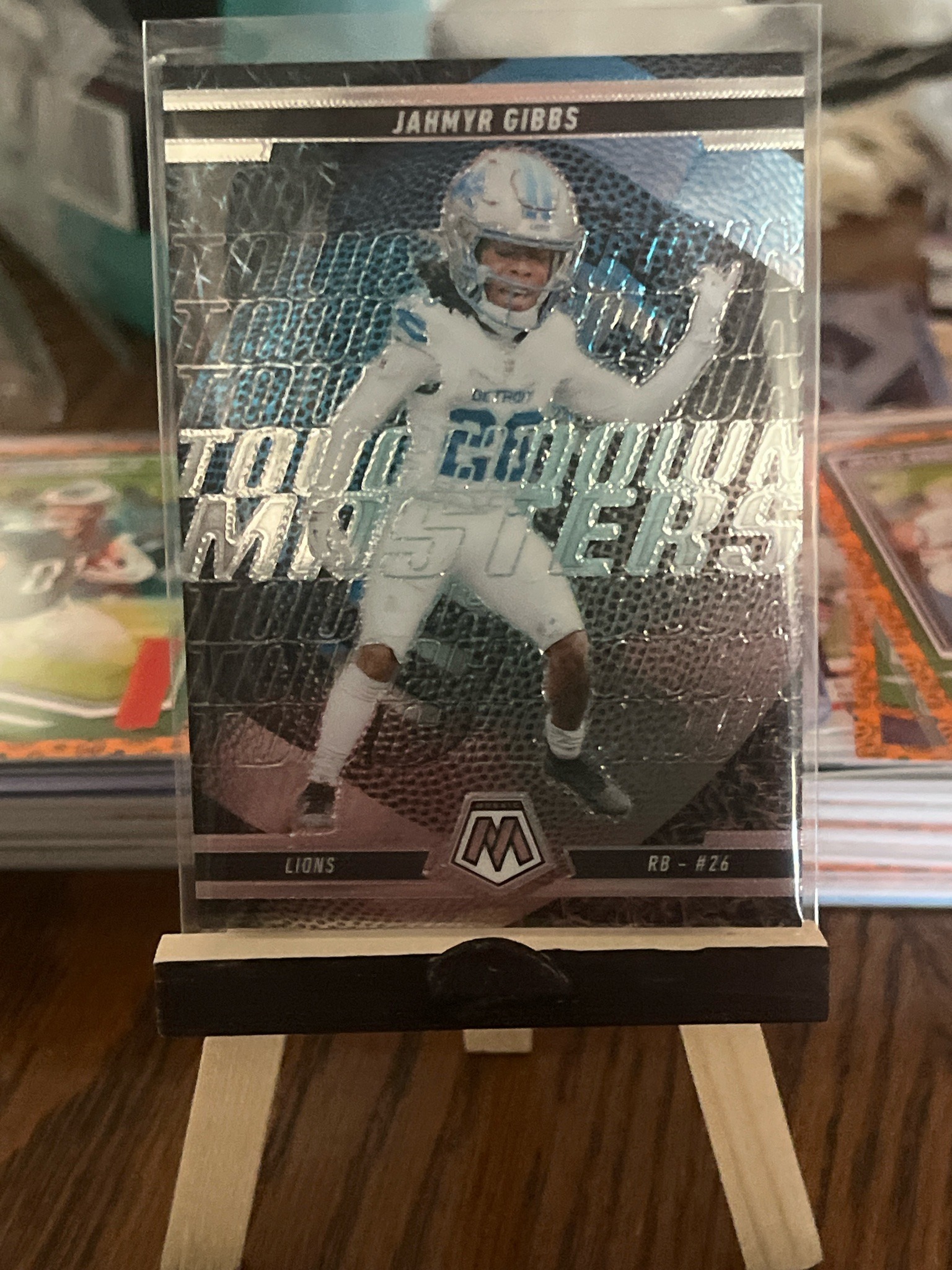 This is a 2023 modern sports trading card featuring Jahmyr Gibbs of the Detroit Lions. The card is part of the 'Touchdown Masters' insert set from the Panini Mosaic football series. Physically, the card is constructed from high-quality cardstock with a chrome-like 'Optichrome' finish, characterizing the Mosaic brand. It features the signature silver Mosaic Prizm parallel background, which displays a repeating pattern of small tiled circles that refract light at various angles. The card front shows an action shot of Gibbs in his white Detroit Lions away jersey and helmet, overlaid on a bold, silver-foiled 'TOUCHDOWN MASTERS' typographic background. The player name 'JAHMYR GIBBS' is printed at the top center on a dark banner, while the bottom of the card includes the 'Lions' team name, the 'RB - #26' designation, and the central Mosaic 'M' logo. In terms of condition, the card appears to be in excellent to near-mint state, currently housed in a clear protective penny sleeve. The corners appear sharp and the edges show no obvious chipping typical of chrome finishes. The centering seems slightly top-heavy, but overall the surface maintains a high luster without visible scratching or dimples. As a 2023 release, it represents Gibbs' rookie year, which significantly enhances its desirability among collectors. The craftsmanship is typical of Panini's premium product lines, featuring precision die-cutting and vibrant, high-definition printing.
