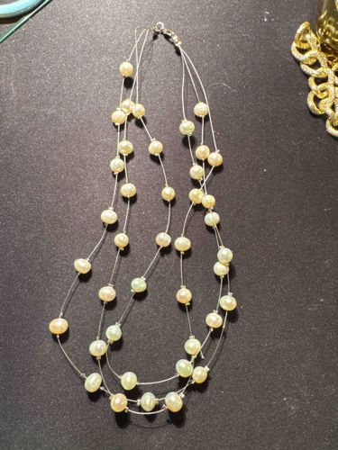 This jewelry piece is a triple-strand 'floating' or 'illusion' style necklace featuring numerous cultured pearls, likely freshwater in origin. The pearls are spaced out along thin, transparent or metallic silver-toned filaments, creating the visual effect that they are suspended around the neck. The pearls exhibit a range of natural shades including creamy white, pale peach, and soft iridescent lavender-pink. Each pearl appears to be semi-baroque or button-shaped rather than perfectly spherical, indicative of a natural culturing process. They are secured in place by small metallic crimps or beads that prevent them from sliding along the three distinct tiers of varying lengths. The necklace is finished with a metal lobster claw or spring ring clasp assembly in a silver-tone finish. Physically, the construction relies on the tension of the fine cordage, which shows some slight twisting but remains structurally intact. There are no immediate signs of significant peeling or nacre loss on the pearls, though there is a soft, organic patina consistent with contemporary fashion jewelry. This style was particularly popular in the late 20th to early 21st centuries. The craftsmanship is clean with consistent spacing, suggesting a well-made commercial or artisan accessory.