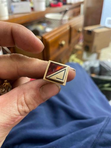 A single square-shaped cufflink featuring a geometric Mid-Century Modernist design. The face of the cufflink is divided diagonally by a gold-tone raised border, creating two distinct triangular sections. The upper-left triangle is inlaid with a deep reddish-brown tortoise shell material or a semi-translucent faux resin imitating amber or tortoise. The lower-right triangle is composed of textured gold-tone metal with an incised or enameled 'L' or hook-shaped graphic element. The outer border consists of a double-stepped frame, typical of 1950s or 1960s men's accessory aesthetics. Based on the visible color, it is likely gold-plated base metal (costume jewelry) rather than solid gold, showing some light surface wear, minor scratches, and potential oxidation around the edges of the inlay. No maker's mark is visible from this angle, but the design echoes the work of manufacturers like Swank, Foster, or Hickok. The item displays a vintage patina consistent with mid-20th-century age.