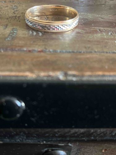 This is a vintage-style two-tone wedding band crafted from 14-karat gold. The ring features a distinct multi-metal construction with a classic yellow gold base and interior. The central exterior rail is enhanced with a white gold or rhodium-plated inlay featuring deep diagonal diamond-cuts, which create a high-reflectivity, textured pattern reminiscent of a woven or feathered design. Flanking this central pattern are thin, polished yellow gold borders with fine milgrain detailing or micro-beading on the extreme edges, adding a touch of traditional craftsmanship. The interior of the band is clearly stamped with a '14K' hallmark followed by what appears to be a maker's mark or brand initials, though the light makes the secondary stamp slightly indistinct. The band has a slight dome profile and a width estimated at approximately 6-7mm. Regarding its condition, the piece shows evidence of previous wear including many fine surface scratches (swirl marks) on the interior and exterior yellow gold sections, and a slight flattening of the decorative texture in high-contact areas, indicating it was likely worn daily for several years. This style was highly popular in the late 20th century, specifically the 1980s and 1990s, and is characterized by its substantial weight and contrasting metal tones.