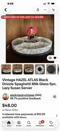 Vintage Hazel Atlas Black Drizzle Spaghetti Milk Glass 5-Piece Lazy Susan Server