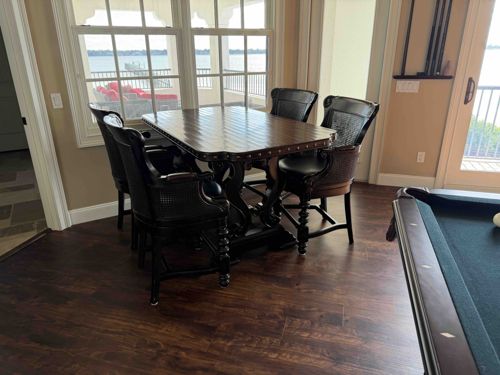 This is a high-end, Mediterranean-inspired counter-height dining set consisting of a substantial rectangular trestle table and four matching armchairs. The table features a thick, plank-style top with a polished wood finish and decorative metal nailhead trim surrounding the apron. It is supported by an ornate double-pedestal trestle base with heavy scrolled corbels and a central stretcher, all finished in a dark, espresso-colored stain. The accompanying chairs are counter-height armchairs with a sophisticated 'British Colonial' influence, featuring woven cane or rattan back panels, rolled crest rails, and sculpted armrests. The chair legs are elaborately turned with a spool or ring motif, typical of high-quality traditional craftsmanship. The seats appear to be upholstered in a dark leather or faux-leather material. The overall construction suggests modern high-end manufacturing (likely late 20th to early 21st century) using solid hardwoods. The condition appears excellent with a lustrous patina on the wood surfaces and no visible structural damage, though minor surface scuffs consistent with residential use may be present at the base. This set exhibits superior design details, such as the mixed use of wood, metal accents, and woven textures, indicating a luxury furniture tier.