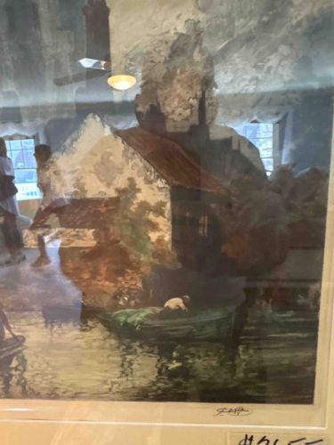 This item is a framed and matted fine art lithograph print featuring a rustic European or American riverside landscape. The central image depicts a cluster of stone and timber buildings, possibly a mill, adjacent to a body of water where a green rowboat and a figure are visible. The artwork is characterized by an impressionistic style with a palette of earth tones—browns, ochres, and deep greens—contrasted against a grayish-white sky. The composition utilizes soft lighting to create a nostalgic, atmospheric mood. Notably, the print is hand-signed in pencil in the lower right-hand margin. The signature appears to be that of G. Harvey (Gerald Harvey Jones), a renowned American artist known for his historical and western-themed scenes. The piece is housed behind glass with a neutral cream-colored mat. Regarding condition, the image is partially obscured by heavy reflections in the photograph, but the print itself appears well-preserved within its framing. No significant foxing, fading, or water damage is immediately apparent on the paper. The lithograph likely dates to the late 20th century, a period during which Harvey’s work gained significant commercial popularity.