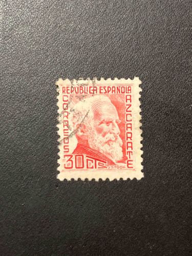 This is a vintage postage stamp from the Second Spanish Republic era, featuring a portrait of the philosopher and politician Gumersindo de Azcárate. The stamp is printed in a distinct vibrant reddish-orange or vermilion ink on off-white paper. Centrally, the engraving depicts the subject in profile facing right, characterized by a detailed beard and formal attire. The typography includes 'REPUBLICA ESPAÑOLA' at the top, 'AZCARATE' along the right edge, 'CORREOS' on the left, and a '30 CTS' denomination at the bottom left. The stamp features standard line perforations. Condition-wise, the specimen shows a visible black circular date stamp cancellation (CDS) on the left side, indicating it has been used. The perforations appear relatively intact, though some foxing or light aging is visible on the paper stock. The engraving shows fine cross-hatching and line-work indicative of high-quality intaglio printing typical of early 20th-century European philately. The stamp likely dates to the early years of the Republic, circa 1931-1934, and remains a significant philatelic artifact of Spanish political history.