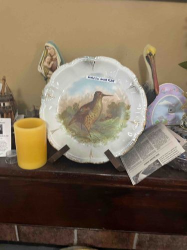 This is a finely crafted hand-painted porcelain cabinet plate featuring a detailed game bird, specifically a woodcock, as its central motif. The plate is constructed from high-quality white porcelain with a scalloped or fluted edge, characteristic of late 19th-century to early 20th-century European craftsmanship, likely of Limoges (French) or German origin. The central scene displays an original hand-painted depiction of a bird in its natural marshland habitat, utilizing a palette of earth tones including ochre, sienna, and forest green, set against a soft blue and atmospheric sky. The rim is embellished with embossed architectural or floral motifs highlighted with gilded accents, which exhibit minor age-appropriate wear but remain largely intact. According to the provided context, the item is an original hand-painted piece in excellent condition, showing no visible cracks, chips, or significant crazing in the glaze. The artisanal quality of the feather detail and the soft blended background suggest a skilled professional decorator rather than amateur work. Measuring approximately 8 to 10 inches in diameter, this plate represents the Victorian and Edwardian interest in sporting and nature-themed decorative arts, often used for display in formal dining rooms or libraries.