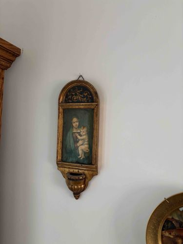 This wall-mounted devotional object consists of a wooden holy water font (stoup) featuring a central arched tabernacle-style frame. The central panel displays a printed or painted depiction of the Madonna and Child, rendered in an Italian Renaissance style inspired by masters like Raphael. The Virgin Mary is draped in a blue mantle holding a nude Christ Child against a dark background. The Frame is constructed from gilt-finished wood or composite material, featuring an arched pediment at the top decorated with gold-toned scrolled filigree against a dark ground. Below the rectangular image is a protruding, fluted basin designed to hold holy water, tapering to a decorative finial. The overall finish shows a gold-leaf or metallic gilt patina with intentional distressing or age-related wear, including visible darkening in the recessed areas and minor abrasions to the gilded edges. The piece appears to be a 20th-century souvenir or devotional item produced in Italy (likely Florence), characterized by its 'Fratelli Alinari' or similar traditional Florentine aesthetic. It reflects Catholic liturgical craftsmanship with a focus on classical religious iconography and Baroque-inspired decorative molding.