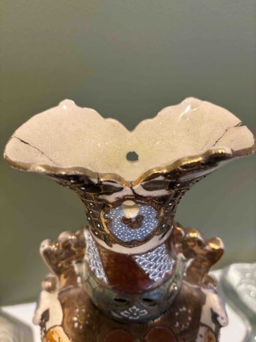 This is a detailed Japanese Satsuma-style porcelain or earthenware decorative vase, likely dating from the late 19th century (Meiji period) to the early 20th century. The piece features a highly ornate flared rim with a scalloped, quatrefoil-inspired edge and a constricted neck leading into a bulbous body with applied decorative handles. The construction material is a dense ceramic, visible through significant crazing on the internal cream-colored glaze. The exterior is richly decorated with 'moriage' (raised enamel) techniques and heavy gold gilding. Colors include a palette of burnt orange, cobalt blue, and earthy greens, set against intricate geometric patterns such as 'asa-no-ha' (hemp leaf) and fish scale motifs. Notable features include small circular perforations or 'air holes' in the neck and body, possibly intended for incense or as part of a multi-piece assembly. The condition is significantly compromised, showing multiple structural cracks running vertically from the rim down into the neck, along with some glaze loss and wear to the gilding. These visible fractures suggest a high degree of fragility and previous impact damage. The craftsmanship is typical of Export Satsuma ware, designed for Western markets, focusing on dense, complex surface ornamentation rather than minimalist traditional Japanese aesthetics.