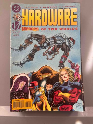This is a physical copy of the comic book 'Hardware' issue #44, published in October 1996 by Milestone Comics and DC Comics. The cover artwork features the character Hardware suspended in chains above a group of other characters, including ICON, Rocket, and members of the Blood Syndicate. The creative credits listed at the top include Illidge, Rollins, and Caesar. The issue is part of the 'Heroes of Two Worlds' storyline. Regarding its physical condition, the comic shows signs of significant wear consistent with a mid-to-lower grade. Notable defects include a prominent vertical crease or 'spine roll' along the left edge, blunted and slightly frayed corners, and multiple color-breaking stress marks along the spine. There are visible white scuff marks and surface abrasions on the front gloss, particularly near the top-left logo area and the central figure's legs. The bottom edge appears slightly feathered. The pricing on the cover indicates a retail cost of $2.50 USD and $3.50 CAN. The cover utilizes standard glossy paper stock common to the mid-1990s' 'modern age' of comic books, with a high-contrast color palette of blue, yellow, and red. The manufacturing quality is standard for mass-produced periodicals of this era, though the visible spine damage suggests it has not been stored in a protective bag and board.