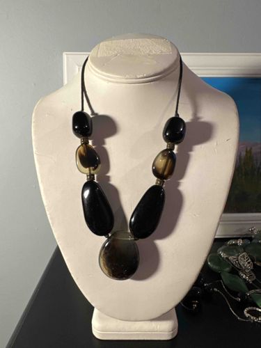 This contemporary statement necklace is composed of seven large, organic, pebble-shaped beads arranged symmetrically on a thin dark cord. The central focal bead is a translucent grayish-brown resin with internal swirls, flanked by two elongated opaque black resin beads. Following these are two smaller translucent smoky beads, and finally, two shorter opaque black rounded beads at the top. Small metallic-looking spacer beads, possibly brass or oxidized metal, are placed between the resin components to add texture and articulation. The resin pieces exhibit a high-gloss polished finish, reflecting light across their rounded surfaces. The construction suggests a modern fashion jewelry piece, likely from the late 20th or early 21st century. The condition appears to be very good with no visible chips, heavy scratching, or clouding to the resin. The cords show slight tension but remain intact without fraying. While no maker's marks are visible in the photograph, the weight and uniformity of the resin suggest industrial manufacturing for the mass or boutique market. Its minimalist aesthetic aligns with contemporary 'bold' jewelry trends, focusing on scale and monochromatic tones rather than precious materials.