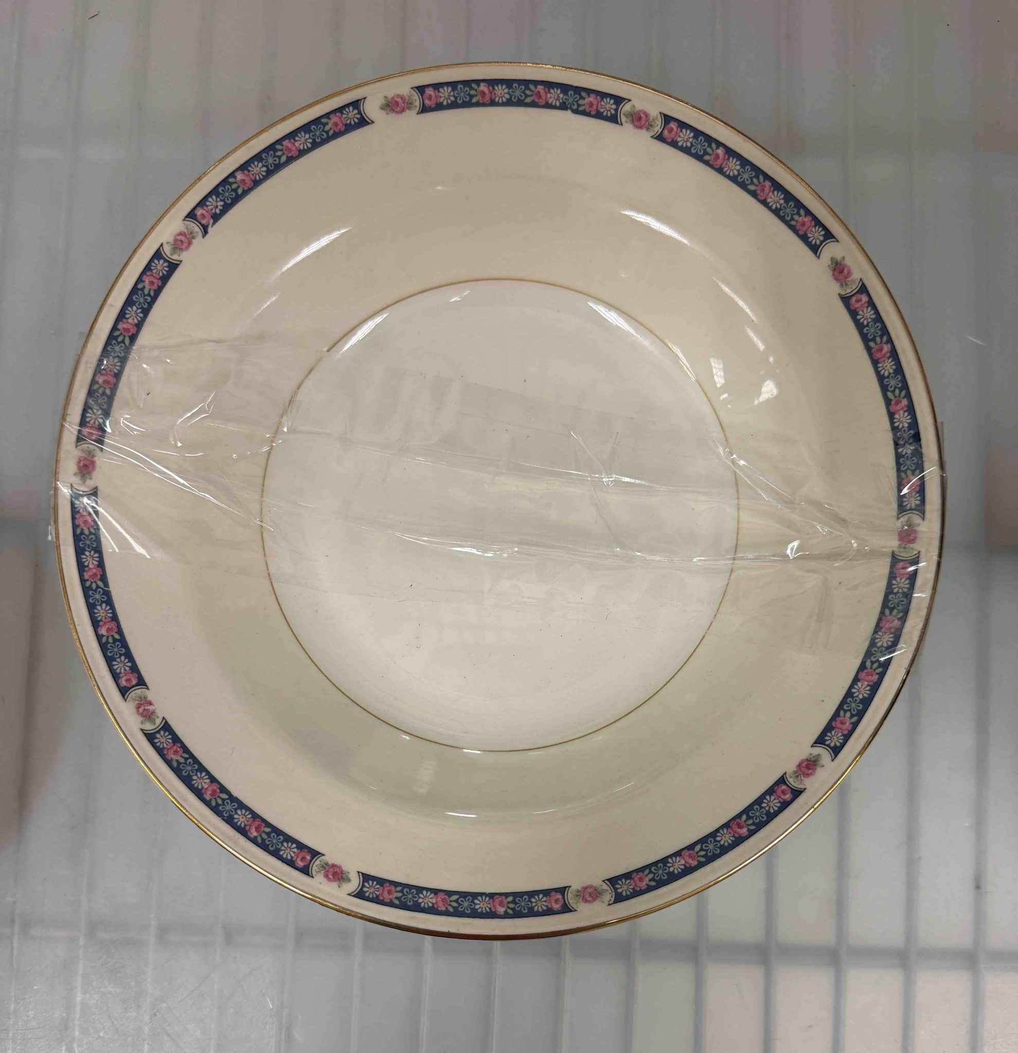 This is a vintage semi-vitreous china soup bowl produced by the Homer Laughlin China Company in the United States. The piece is part of the 'Eggshell Nautilus' line, characterized by its lightweight, thin-walled body and ivory or cream-colored glaze. The bowl features a decorative border consisting of navy blue bands alternating with floral arrangements of pink roses and delicate greenery. A fine gold-gilt rim finishes the outer edge. The backstamp 'Eggshell Nautilus USA, F 44 N 6' indicates a production date of June 1944 at the Laughlin plant No. 4. Construction is fine yet durable, typical of mid-20th-century American dinnerware. The condition appears fair to good with some visible wear to the gold trim on the outer edge, which is common for pieces of this age. There are no immediate signs of chips or cracks visible under the protective plastic wrap, though a slight patina and potential surface utensil marks consistent with use may be present. The craftsmanship reflects the high-volume yet quality-controlled production standards of the West Virginia pottery industry during the WWII era.