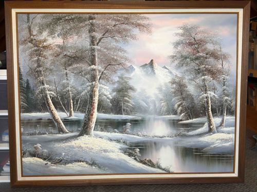This item is a large-format landscape oil painting on canvas, depicting a serene winter scene with alpine characteristics. The composition features a snowy foreground with several prominent birch or deciduous trees, their branches laden with frost or light snow. In the background, a jagged, snow-capped mountain peak rises toward a soft sky tinted with pale pink and lavender hues, suggesting sunrise or sunset. A calm body of water in the middle ground perfectly reflects the mountain and surrounding trees. The painting utilizes a cool color palette dominated by whites, grays, and soft blues, with subtle warm accents in the sky. The technique appears to be wet-on-wet, reminiscent of the mid-to-late 20th-century decorative landscape style popular in suburban homes. The artwork is housed in a substantial wooden frame with a light-colored inner linen liner or fillet, common for pieces from the 1970s or 1980s. The paint application is textural, with visible impasto in the snow details. While no signature is immediately clear in the lower corners, the overall quality suggests it may be a decor painting or a work by a prolific regional artist. The condition appears sound, with no visible tears or significant localized yellowing, though the frame shows minor age-related scuffing.