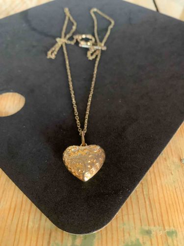 This item is a gold-toned necklace featuring a prominent heart-shaped locket pendant suspended from a delicate cable link chain. The pendant exhibits a puffy, three-dimensional construction with intricate scrollwork and floral filigree engraving across its front surface. The metal displays a consistent yellow gold luster, though subtle variations in the finish suggest it may be gold-filled or high-quality gold plating over a base metal rather than solid gold. The chain measures approximately 18 to 20 inches and utilizes a traditional spring ring clasp for security. Regarding condition, the piece shows minor surface abrasions and a light patina consistent with moderate wear and age, likely dating from the mid-to-late 20th century. There are no immediate maker's marks visible in the photograph, but the hinge on the side of the heart confirms its function as a locket. The craftsmanship is refined, with the engraved detailing providing a romantic, Victorian-revival aesthetic. The overall integrity of the piece appears solid, with no visible dents to the puffed heart or kinks in the chain links.