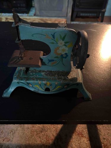 This is a vintage child's toy sewing machine, likely manufactured by Casige in West Germany between the 1940s and 1950s. The machine is constructed from stamped sheet metal and cast iron components, featuring a distinctive light blue or aqua enamel finish. It is decorated with colorful floral lithography, showcasing white, yellow, and blue flowers with green leaves on the main body, and a complementary scrolling motif on the base. The device features a manual hand-crank wheel on the right side and a small needle plate assembly on the left. Measuring approximately 7 to 8 inches in height, the machine sits on a flared, four-footed base designed for stability. Regarding condition, the piece shows significant signs of age and play wear; there is heavy rusting and paint loss centrally located on the base and along the edges of the sewing platform. The metallic components like the needle bar and tension discs show oxidation and a dark patina. Despite the surface corrosion, the lithographic floral patterns remain largely visible, particularly on the upper neck of the machine. These machines were popular post-WWII exports and are known for their simple chain-stitch mechanism, reflecting mid-century industrial toy craftsmanship.