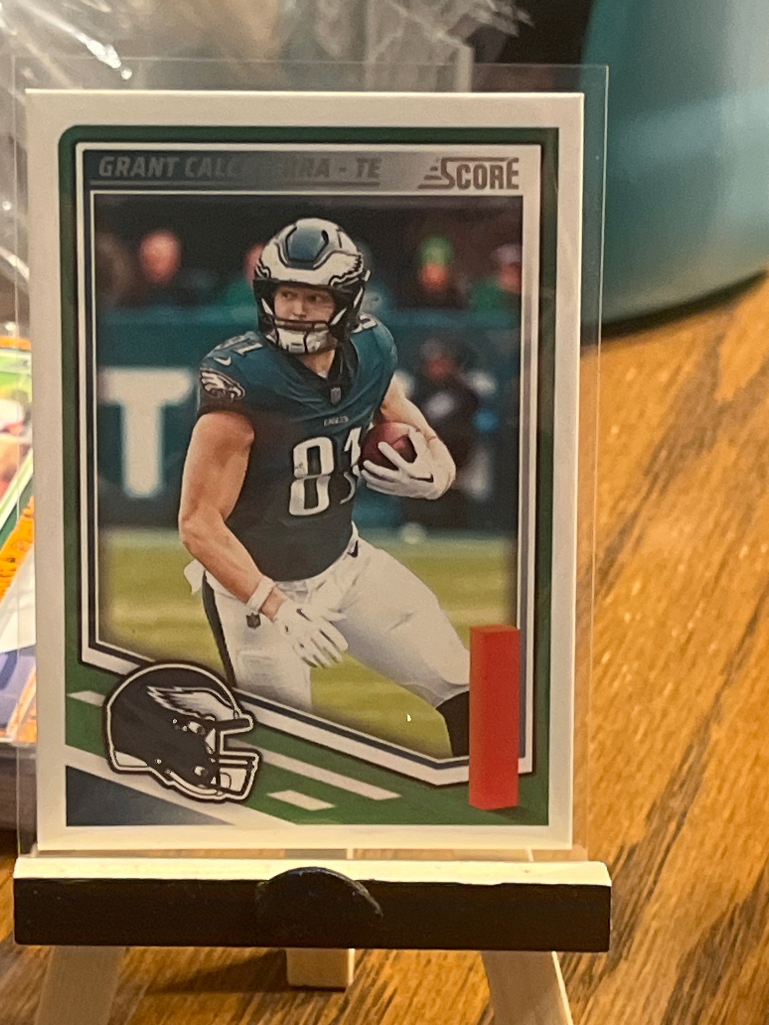 This is a modern sports trading card featuring Grant Calcaterra, Tight End for the Philadelphia Eagles, from the 2023 Panini Score football set. The card measures a standard 2.5 by 3.5 inches and is constructed from light cardboard stock with a glossy finish. The design features a white border surrounding a dark green interior frame that echoes the Eagles' team colors. The central image is an action shot of Calcaterra in his home green and white uniform, carrying a football against a blurred stadium background. Notable markings include the player's name at the top left, the 'Score' brand logo at the top right, and an Eagles helmet graphic in the lower left corner. A stylized red pylon graphic is positioned in the lower right. The card appears to be in very good condition, housed in a protective clear plastic 'penny sleeve' to prevent surface scratches. The centering appears slightly heavy toward the left border. The corners and edges, viewed through the sleeve, appear sharp with no visible whitening or chipping. This card represents a modern 'base' card from an entry-level set, characterized by its straightforward photography and clean, graphic-heavy design typical of the 2020s era of sports collectibles.