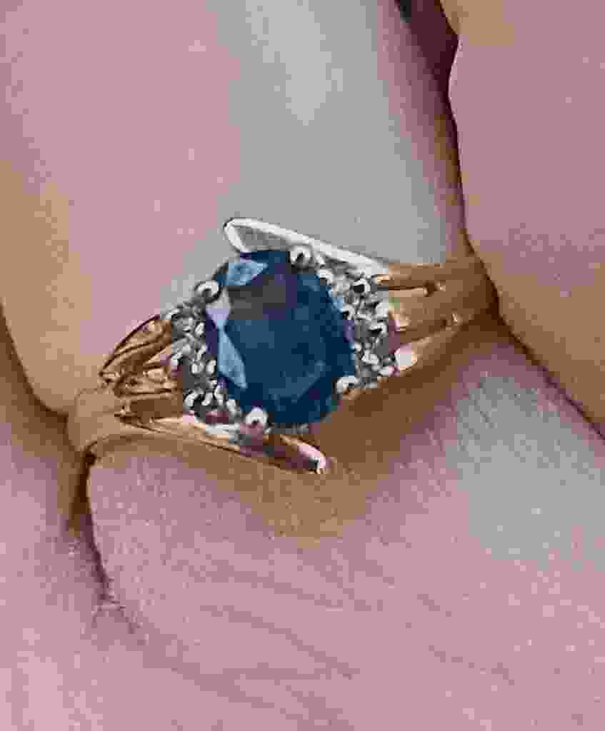 JGL 10KP yellow gold with solitary oval-cut sapphire and 3 diamond chips on each side of sapphire.