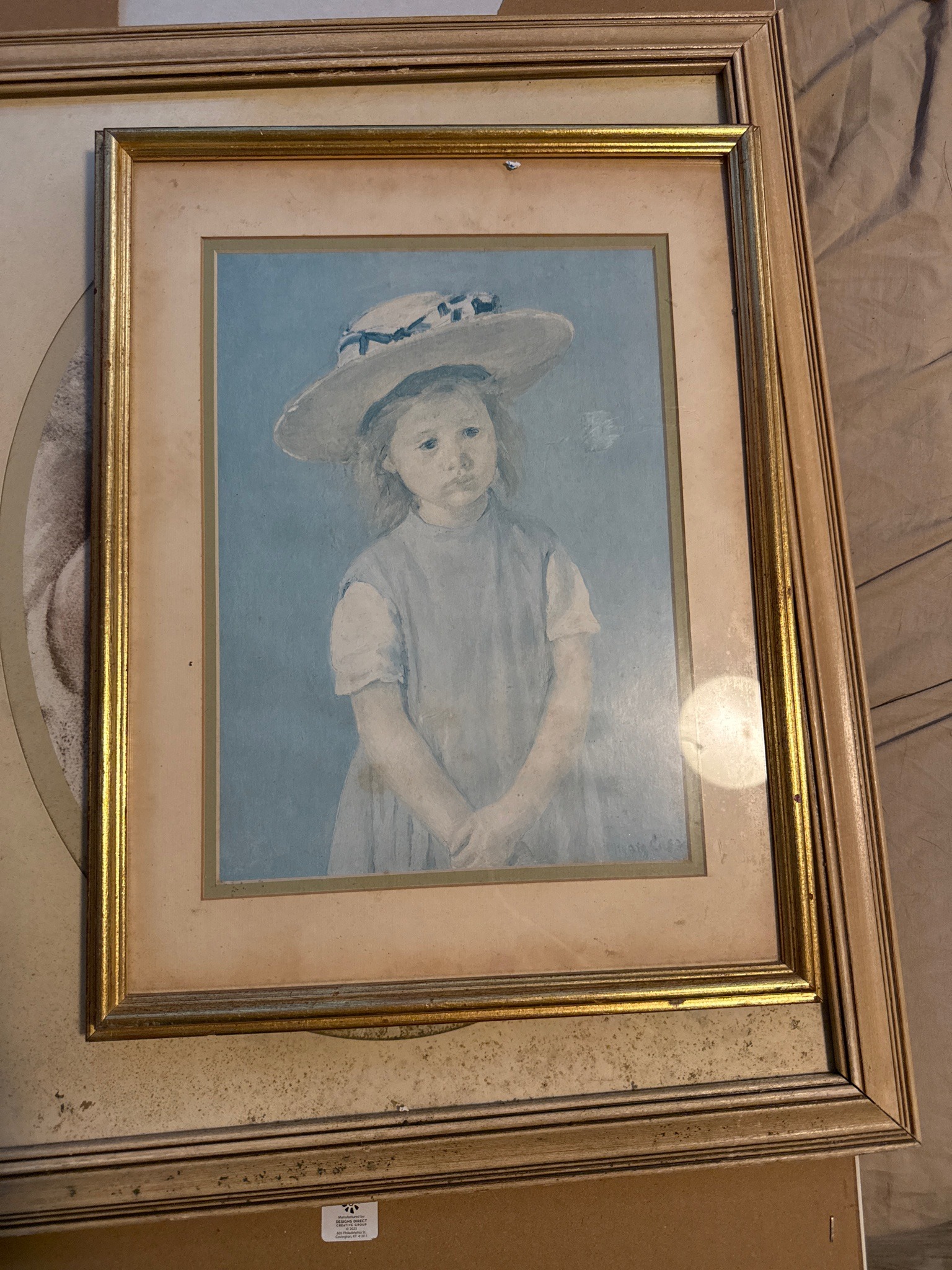 This item is a commercially produced art print featuring a reproduction of Mary Cassatt's celebrated painting, 'Child in a Straw Hat' (originally painted circa 1886). The image depicts a young girl in a blue pinafore and a wide-brimmed straw hat decorated with a blue ribbon, rendered in soft pastel-like tones of blue, cream, and peach. The print is housed in a contemporary, decorative gold-toned wooden or composite frame with a beaded inner border. A cream-colored mat surrounds the artwork, showing visible signs of age including significant foxing, spotting, and general yellowing/discoloration particularly along the bottom edge. A subtle green secondary mat border is visible just inside the cream matting. The artwork itself appears to have a slightly textured surface, common in high-quality prints to emulate canvas or original medium. The lower right corner of the print bears a printed signature 'Mary Cassatt'. Notably, the larger surrounding frame seen in the background features a manufacturer's label from 'Designs Direct Creative Group', dated 2021, suggesting this specific assembly or its companion pieces are modern decorative items rather than antique originals. The condition of the primary print shows some fading and the aforementioned moisture/age damage on the matting, which may affect its aesthetic value but identifies it as a decorative household item.