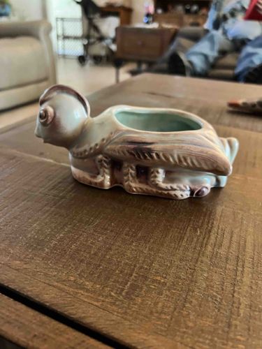 This is a vintage ceramic planter fashioned in the form of a stylized bird, likely a fledgling or a songbird, resting on the ground with its wings tucked. The piece is characteristic of mid-20th-century American art pottery, specifically echoing the designs produced by Hull Pottery. It features a soft, pastel color palette consisting of a pale seafoam green or celadon base glaze with hand-painted or airbrushed matte brown accents highlighting the crest of the head, the eyes, the wing feathers, and the textured base. The molded details show feathered textures on the wings and a rope-like or braided texture along the bottom edge. Physically, the item appears to be made of heavy earthenware or stoneware with a satin matte finish. The interior is glazed in a matching seafoam green, indicating it was intended to hold water and a small plant. In terms of condition, the glaze appears to be in good vintage state, though there is a small visible chip or glaze loss on the lower right edge and some minor surface wear consistent with age. There are no prominent maker's marks visible in the image, but the style, glaze application, and subject matter strongly suggest a 1940s-1950s production era. The craftsmanship is typical of high-volume art pottery from this period, showing good detail in the mold but with the slight variations inherent in hand-applied coloration.
