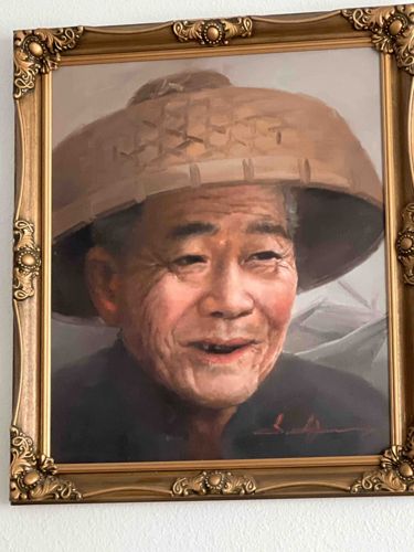 Portrait Painting of an Elderly East Asian Man in a Traditional Woven Hat