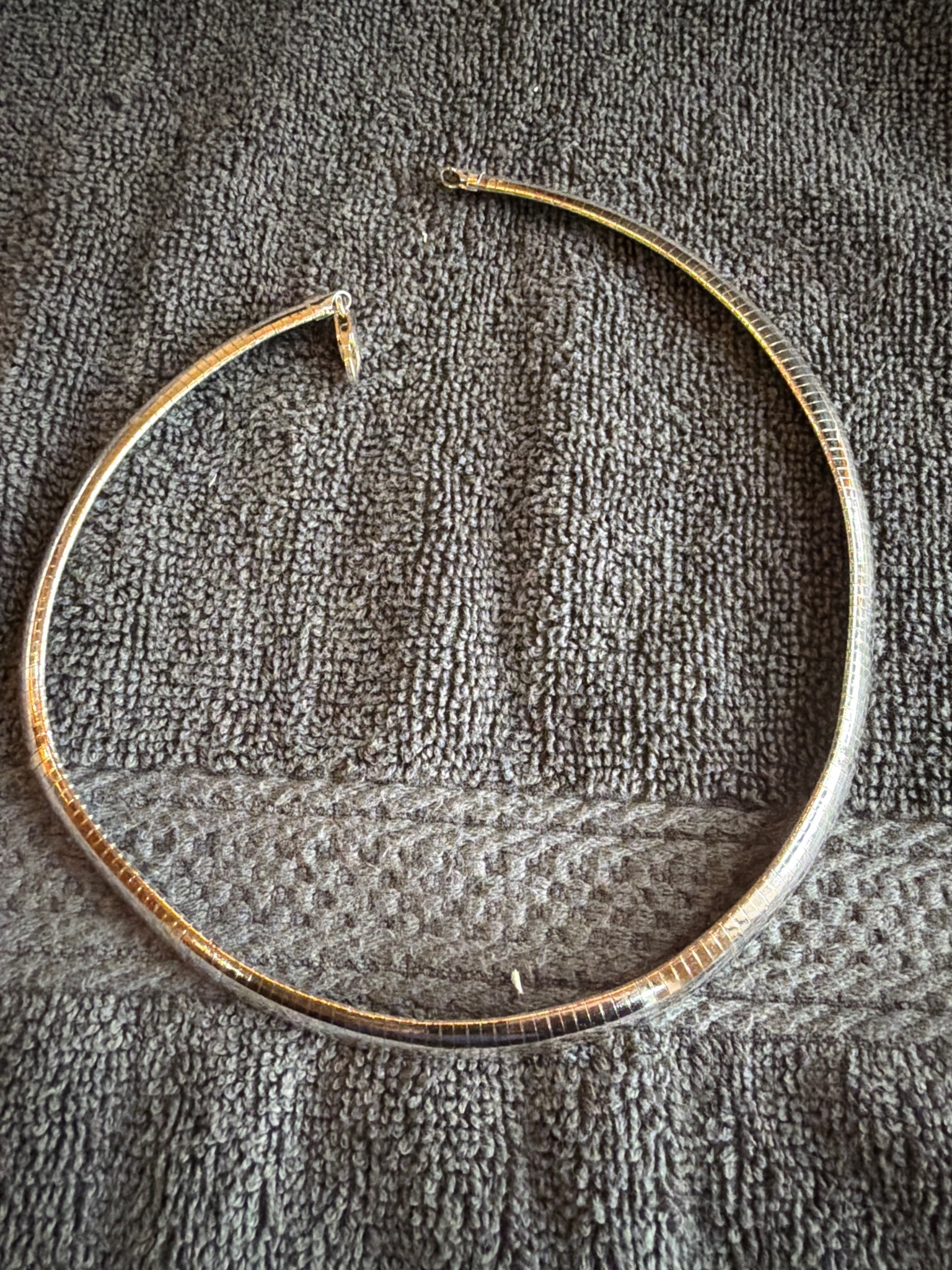 This item is a classic sterling silver omega chain necklace, measuring approximately 16 to 18 inches in length with a width of roughly 4-6mm. The necklace is constructed from overlapping, domed metal plates that are meticulously joined onto a flexible mesh or wire substructure, creating a smooth, silk-like reflective surface. As noted in the context, it is made of real silver, likely .925 sterling silver, which is evidenced by its bright, high-polish luster and slight yellowish reflections characteristic of the metal. The construction is semi-rigid, allowing the piece to hold a circular collar shape when worn. The piece features a lobster claw or spring ring clasp attached to flat end caps. Regarding condition, the necklace appears in good vintage condition with minor surface scratches and light tarnishing or 'patina' consistent with age and occasional wear. There are no immediate signs of 'kinking,' which is a common damage point for omega chains. Based on the design and construction style, this piece likely dates from the late 20th century (1980s-1990s), a period when bold, sleek silver silhouettes were highly popular. The craftsmanship is high-quality, showing uniform plate alignment and a clean finish on the terminals.