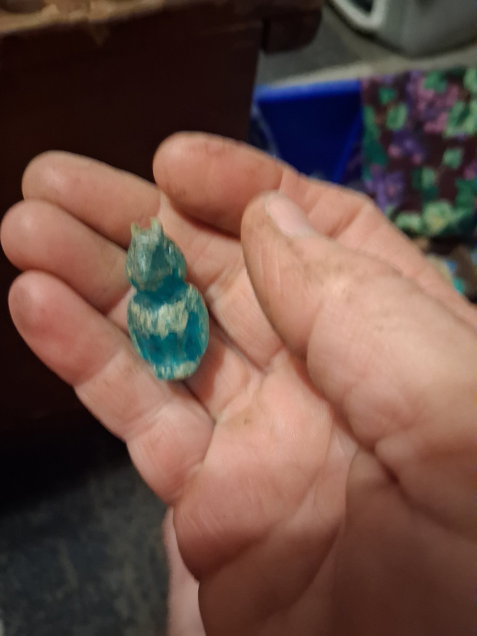 This is a miniature figurine of an owl, measuring approximately 1 to 1.5 inches in height, fitting easily within the palm of a hand. The item is crafted from a translucent teal-colored material, likely glass or possibly a vitrified ceramic such as Egyptian faience. It features a rounded body with a distinct head and subtle pointed ear tufts characteristic of a great horned owl. The surface is notable for significant white/cream weathering or calcification deposits, particularly concentrated on the owl's breast and facial area, which suggest possible burial or long-term exposure to moisture. This patina alternates with the vibrant, translucent blue-green of the base material. The craftsmanship is stylized rather than highly detailed, giving it an ancient or folk-art aesthetic. No specific maker's marks or signatures are visible in the imagery, which is common for small decorative or talismanic objects of this type. The condition appears stable, though the heavy surface accretion obscures the finer details of the original carving or mold. This style mimics Late Period Egyptian amulets or mid-20th-century art glass novelties designed with a faux-antique finish.