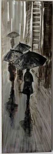 This piece is a contemporary 3D metal wall sculpture featuring an urban rainy street scene with three figures carrying umbrellas. The medium is hand-ground aluminum plate, showcasing a monochrome palette of silver, charcoal, and black. A notable physical characteristic is the intensive surface texture; the metallic background is meticulously grinded with radial and linear patterns that catch and reflect light, creating a sense of movement similar to falling rain and glistening pavement. The figures are rendered using high-gloss black and sepia-tone enamels or acrylics, providing a sharp contrast against the matte and brushed metallic surfaces. The composition is a vertical orientation, common for slim wall spaces. The construction appears to be a multi-layered process where the metal is etched or ground before the pigments are applied. Condition-wise, the piece appears well-maintained with no visible oxidation, scratches, or dents across the metallic face. This style of 'grind art' gained popularity in the early 21st century (circa 2010-present) and is characterized by its interactive relationship with ambient lighting. There are no discernible maker's marks visible in the provided image, suggesting it may be a boutique production or studio piece. The craftsmanship is evident in the precision of the grinding patterns which align with the perspective of the city buildings in the background.