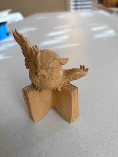 This is a meticulously carved boxwood (Tsuge) netsuke or small okimono depicting a great horned owl perched atop an open book. The piece is rendered in a naturalistic light brown finish, highlighting the fine grain characteristic of high-quality boxwood. The owl features expressive, large eyes, prominent ear tufts, and outstretched wings displaying individual feather detail and textural depth. Its talons are delicately carved as they grip the top edges of the book's pages. The book base is expertly rendered with fine, parallel lines along the top edges to simulate paper leaves, and smooth covers that provide structural stability. This item is likely a mid-to-late 20th-century artisanal creation inspired by traditional Japanese Meiji-style carvings. The craftsmanship displays high technical skill, evident in the dynamic pose and the lifelike texture of the plumage. No significant damage such as cracks or chips is visible, though a gentle natural patina is developing on the smoother surfaces of the book. Typically, such pieces may contain a hidden signature (mei) on the bottom or under the owl's wing, common for contemporary Japanese woodworking. The subject matter—an owl on a book—suggests a symbolic representation of wisdom and scholarly pursuit.