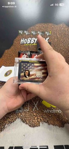 This is a high-end specialty trading card from the Presidential Archive series, featuring an authentic cut signature of George Washington. The card is presented in a horizontal format within a thick, clear protective acrylic magnetic holder. The design features a prominent American flag background with gold-foiled trim along the edges. Centered and slightly to the left is an oval portrait of George Washington. Above the portrait is a transparent window displaying the historical cut signature written in ink on aged, cream-colored paper. To the right of the portrait is a cutout 'relic' window containing a piece of fabric or material associated with the historical figure. The card includes gold-foil text at the top reading 'Presidential Archive' and additional descriptive text at the bottom authenticating the components. The item appears to be in excellent, pack-pulled condition with no visible corner softening or surface scratches through the case. This is a modern luxury collectible manufactured within the last decade, designed for the high-end sports and history memorabilia market. The craftsmanship is high, utilizing multi-layered card stock and precision foil stamping to achieve a museum-quality aesthetic.