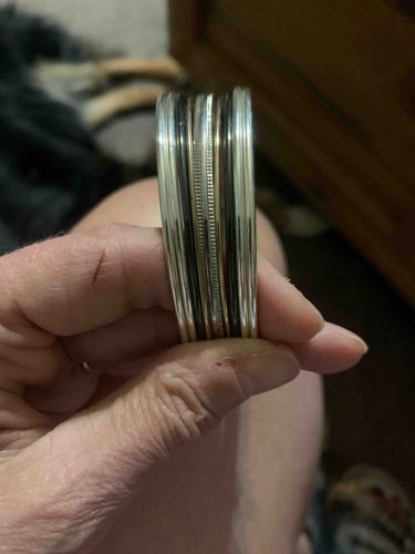 This is a contemporary multi-strand cuff bracelet featuring a sophisticated mixed-metal aesthetic. The piece is constructed from approximately seven distinct bands of varying widths and textures, held together to create a single wide cuff profile. The materials appear to be a combination of sterling silver (indicated by the bright white metallic bands) and another contrasting metal, possibly yellow gold, copper, or brass, providing a warm tonal contrast. The central band features a distinctive 'beaded' or 'milgrain' texture, flanked by smooth, high-polish rounded bands and thinner darkened or oxidized wire elements. The construction suggests a handmade or 'bench-made' quality typical of Southwestern or modern artisanal jewelry. In terms of condition, the piece shows minor surface scratches and faint signs of patina in the recessed areas, which is standard for pre-owned jewelry but does not detract from the overall structural integrity. The use of multiple wire gauges and finishes indicates a high level of craftsmanship and design intent, common in pieces from the late 20th century to modern day. No maker's mark is visible from this angle, though one might expect to find a hallmark such as '.925' or a signature stamp on the interior side of the cuff terminals.