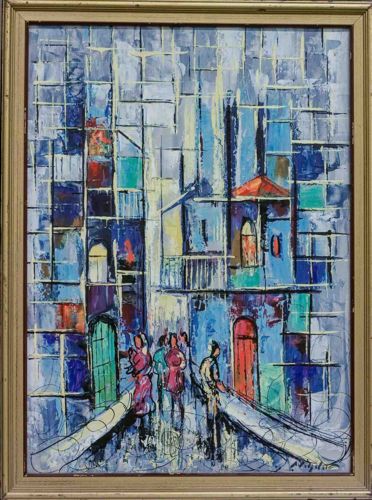 This is an original Mid-Century Modern abstract oil or acrylic painting on canvas, housed in a vintage wooden frame with a metallic gold finish. The composition depicts a vertical urban street scene or courtyard featuring stylized, elongated figures in the foreground. The color palette is dominated by cool blues, whites, and purples, accented with vibrant pops of red, orange, and teal. The technique employs a heavy impasto and a palette knife application, creating a textured, grid-like architectural structure over the scene. Notable features include fine, dark linear work that defines the arched doorways, balconies, and rooftops, reminiscent of the 'Bernard Buffet' school of expressionism. The figures are rendered with gestural, faceless forms in pink and ochre tones. The condition appears fair to good for its age, with visible minor abrasions and scuffing on the frame's finish, particularly along the edges. The canvas shows a slight unevenness in tension but no immediate signs of tearing or major paint loss. A cursive signature is visible in the lower right corner, though it remains illegible without closer inspection. This piece exhibits the energetic, decorative style characteristic of European and American studio art from the late 1950s to the 1960s.