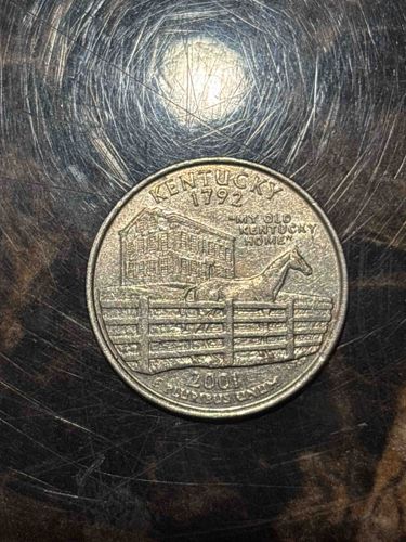 This item is a circulation-issue United States twenty-five cent piece, specifically the 2001 Kentucky State Quarter from the 50 State Quarters Program. The reverse design features the historic Federal Hill mansion, known as 'My Old Kentucky Home,' behind a thoroughbred horse standing behind a split-rail fence. The coin is composed of a cupronickel-clad copper core, displaying a consistent silver-toned metallic luster. Key inscriptions include 'KENTUCKY 1792' at the top, 'MY OLD KENTUCKY HOME' to the right of the building, and '2001 E PLURIBUS UNUM' at the bottom. Physically, the coin exhibits signs of moderate circulation, including numerous small surface scratches, contact marks, and a slight flattening of the higher relief points on the horse and manor house. The strike quality appears standard for business strikes, though the background Fields show some graininess and accumulated grime, particularly in the recessed letters and around the rim. There are no obvious mint errors such as doubling or clipped edges visible. This specimen represents the 15th coin released in the state series, minted in the early 21st century by the United States Mint.