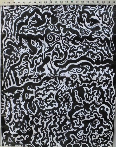 This item is a large-format abstract print featuring a dense, non-representational doodle or psychadelic-style composition. The artwork is executed in a high-contrast black and white palette, characterized by interlocking organic shapes, swirls, and intricate lines that create a complex, horror vacui aesthetic where little empty space remains. The piece measures approximately 21 inches in width as indicated by the ruler at the top, though the provided context suggests a high-resolution digital file size of 2235 x 2813 pixels. The material appears to be a lightweight paper or vinyl, displaying visible signs of handling and storage. Notable condition issues include significant horizontal creasing across the center, along with edge curling and minor wrinkling throughout the surface. The lack of a visible artist signature or manufacturer's stamp suggests a contemporary, possibly amateur or independent production. The style is reminiscent of 1960s psychedelic art or modern street-art doodling, likely produced within the last 20 years. The craftsmanship focuses on repetitive, rhythmic patterns rather than traditional perspective, resulting in a wall-to-wall visual density that serves as a strong decorative focal point.