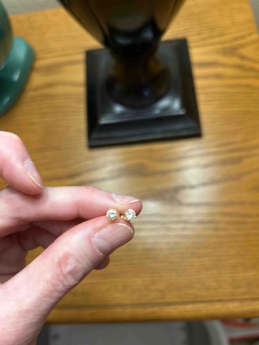A pair of classic round brilliant-cut solitaire stud earrings. Each earring features a clear colorless gemstone, likely diamond or a high-quality stimulant, estimated at approximately 0.25 to 0.40 carats each based on their scale relative to the fingertips. The stones are secured in a four-prong setting made of yellow metal, appearing to be 10k or 14k yellow gold. The craftsmanship utilizes a traditional basket-style mounting which allows light to enter the side of the stones to maximize brilliance and fire. The stones exhibit a high degree of transparency with no visible inclusions to the naked eye from this distance. The metal settings show a bright polished finish with minimal wear, suggesting they have been well-maintained. While specific hallmarks are not visible in the photograph, the style is a timeless mid-to-late 20th-century design that remains a staple in contemporary jewelry. The prong tips appear symmetrical and securely seated over the crown of the gems. Condition overall appears excellent with no missing stones or significant deformation of the posts.