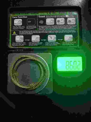 This item is a gold-toned tennis-style bracelet shown resting on the weighing platform of a portable digital pocket scale. The bracelet features a continuous row of small, bright stones—likely cubic zirconia or diamonds—individually set in what appears to be yellow gold or gold-plated links. The bracelet is coiled on a round metal weighing dish. The scale beneath it is a standard portable model with a black plastic housing and an illuminated green LCD screen currently displaying a numerical value of '86.02'. The underside of the scale's hinged lid contains a 'Quick Start Guide' with printed instructions for 'Tare Function', 'Count', and 'Calibration'. The scale features CE and RoHS certification marks on the label. The lighting in the image is dim with a strong green cast from the display. While the specific carat weight or metal purity cannot be verified from the photo alone, the weight shown on the scale is a significant detail for appraisal purposes. No visible maker's marks or hallmarks are legible due to image resolution and positioning. The condition appears to be used but functional, with all stones intact from this perspective.