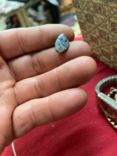 This small, approximately 1cm long semi-precious stone bead exhibits an irregular, organic teardrop or almond shape. The material appears to be either lapis lazuli or sodalite, characterized by a deep cobalt blue base heavily mottled with white to light-tan calcite inclusions and possibly pyrite flecks. A single, off-center perforation is visible near the narrower apex, suggesting its function as a pendant or a focus bead for a necklace or bracelet. The stone features a tumble-polished finish that retains some natural surface pits and geological undulations rather than a perfectly smooth cabochon cut. Its condition shows signs of age-related wear, including softened edges and a matte patina on the surface, which deviates from the high-gloss shine found in modern machine-polished stones. There are no visible maker's marks or signatures, which is typical for small lithic components. Based on the primitive drilling and irregular polishing style, it likely dates from the mid-20th century or earlier, potentially originating from an artisanal or ethnographic jewelry piece from Central Asia or the American Southwest. The charm of the piece lies in its rustic, handcrafted quality and the natural variance of the mineral patterns.