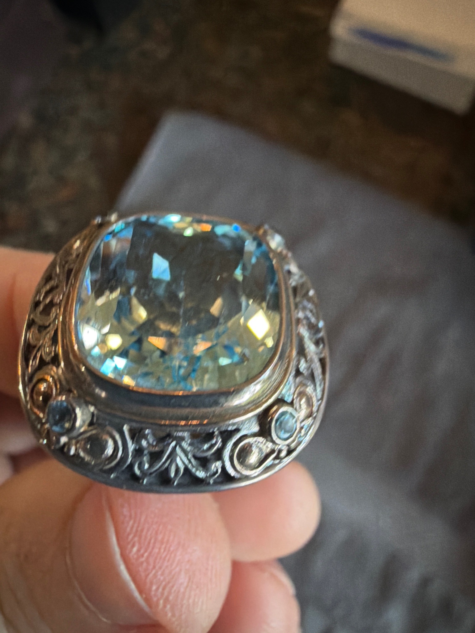 This is a high-end designer statement ring attributed to the Greek jeweler Konstantino. The piece features a centered, large cushion-cut blue topaz with excellent clarity and vibrant light blue saturation, secured in a substantial bezel setting. The ring is meticulously crafted from 925 sterling silver, characterized by the brand's signature intricate Byzantine and neoclassical-inspired scrollwork and filigree. Small 18K yellow gold accents and circular gold granulated details provide a rich bi-metal aesthetic typical of the jeweler's Hellenic style. Flanking the central stone are smaller, round-cut blue topaz melee stones set within the ornate gallery. The metal shows a deliberate oxidized patina in the recessed areas to enhance the depth of the engravings. The construction is solid and heavy, indicating high-quality craftsmanship. Visually, the ring appears to be in very good condition with minor surface abrasions consistent with gentle wear; the stones remain securely set without visible chips. This contemporary piece draws heavily on ancient Greek design motifs and is hand-finished in Athens, Greece.