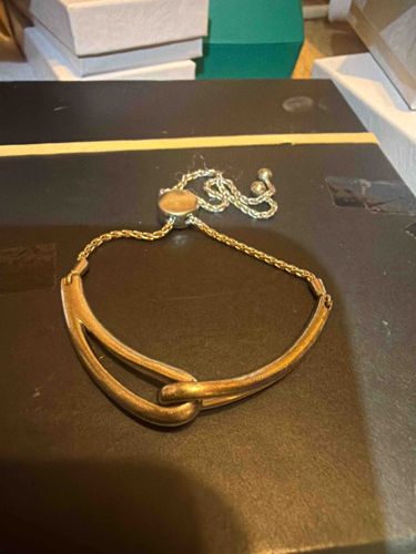 This contemporary jewelry piece is a bolo-style adjustable bracelet featuring a prominent interlocking knot or 'infinity' design as the focal point. The central hardware consists of two smooth, tubular curved bars that interloop to form a modern, sculptural aesthetic. The item appears to be made of a base metal with a two-tone plating finish, showing shades of yellow gold and silver-tone/white gold. A thin, braided wheat or popcorn-style chain extends from each end of the focal bar, culminating in an adjustable slider bead (bolo clasp) with a flat circular top. The ends of the chains are finished with small decorative spherical metal beads to prevent the slider from slipping off. In terms of condition, the item shows significant signs of surface wear and oxidation; there is visible tarnishing, particularly on the inner curves of the knot and the slider bead, suggesting the plating is wearing thin. No prominent maker's marks are visible in the current view, but the style is indicative of modern mass-market fashion jewelry from the late 20th to early 21st century. The craftsmanship is functional, designed for versatility in sizing, though the visible metal fatigue and uneven patina suggest it is a costume piece rather than fine jewelry.