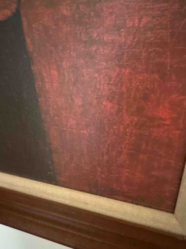 This item is a close-up detail of a framed oil painting, likely dating from the mid-20th century. The work is executed on a textured support, possibly canvas or linen, which is evident through the visible weave pattern underneath the paint layers. The palette is dominated by deep reds, burgundies, and dark earthy tones, applied with a visible, expressive brushwork that suggests an Expressionist or Modernist style. The application of paint appears both layered and scumbled, creating a rich surface interest with varied opacity. The subject matter seems to be a portrait or figurative work, though the zoomed perspective focuses on the shoulder or torso region. The painting is housed in a classic mid-century wooden frame with a stepped profile and a linen or light-colored wood liner, characteristic of 1950s-1970s framing traditions. Regarding condition, there are minor surface abrasions and some dust accumulation along the inner edge of the frame liner. The overall craftsmanship suggests a professional Hand-painted original, though no signature is visible in this specific crop. The depth of color and the use of the support's texture indicate a high level of artistic intent and technical proficiency during the mid-century period.