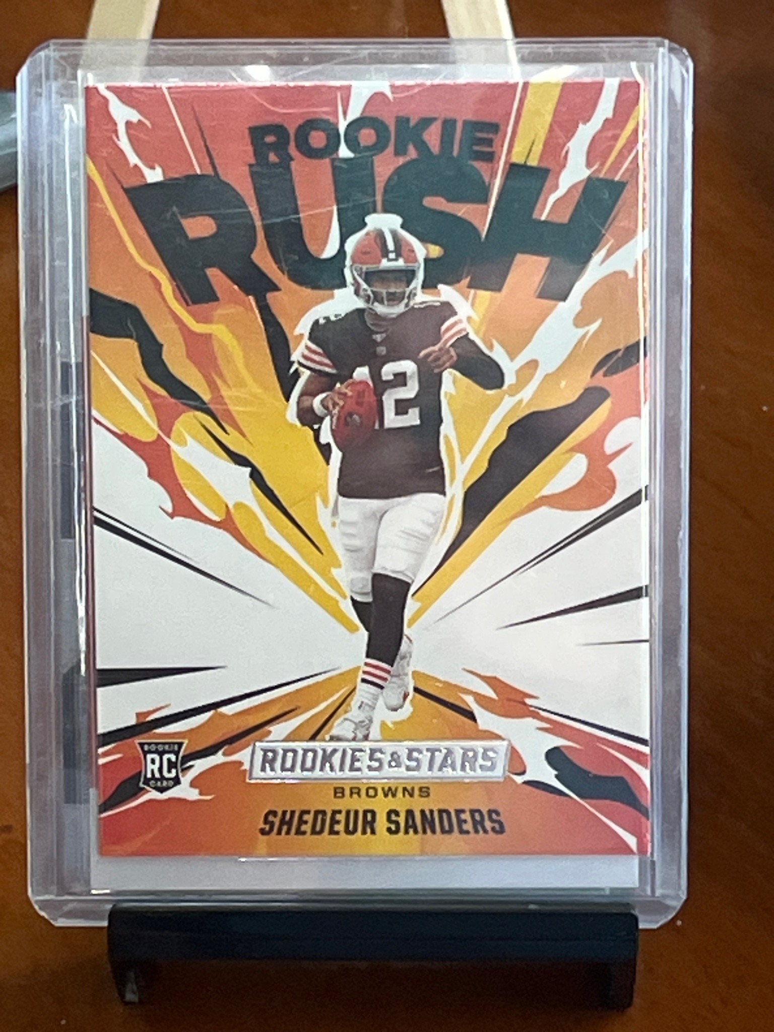 This is a standard-sized trading card (approx. 2.5 x 3.5 inches) featuring college quarterback Shedeur Sanders. The item is protected within a clear plastic top-loader and resting on a black display stand. The design features a multi-color 'comic book' or 'energy' burst background in hues of orange, yellow, and red with 'ROOKIE RUSH' typography at the top. The player is depicted in a brown and white professional jersey with number 2, which appears to be a Cleveland Browns aesthetic. A 'RC' (Rookie Card) logo is visible in the lower-left corner, and the 'Rookies & Stars' branding is centered at the bottom. Notably, this item is likely a 'custom' or 'ACEO' (Art Cards, Editions and Originals) piece, as Sanders is currently a collegiate player and has not yet been officially rostered by the Cleveland Browns. The construction appears to be high-gloss printed cardstock. The condition seems excellent with crisp corners and no visible surface scratches, though there is a Slight white edge on the left side suggesting a minor printing or cutting misalignment common in independent productions. The card lacks an official manufacturer hologram or Panini logo in the corners, further identifying it as a novelty or artistic representation rather than a licensed league-issued product.