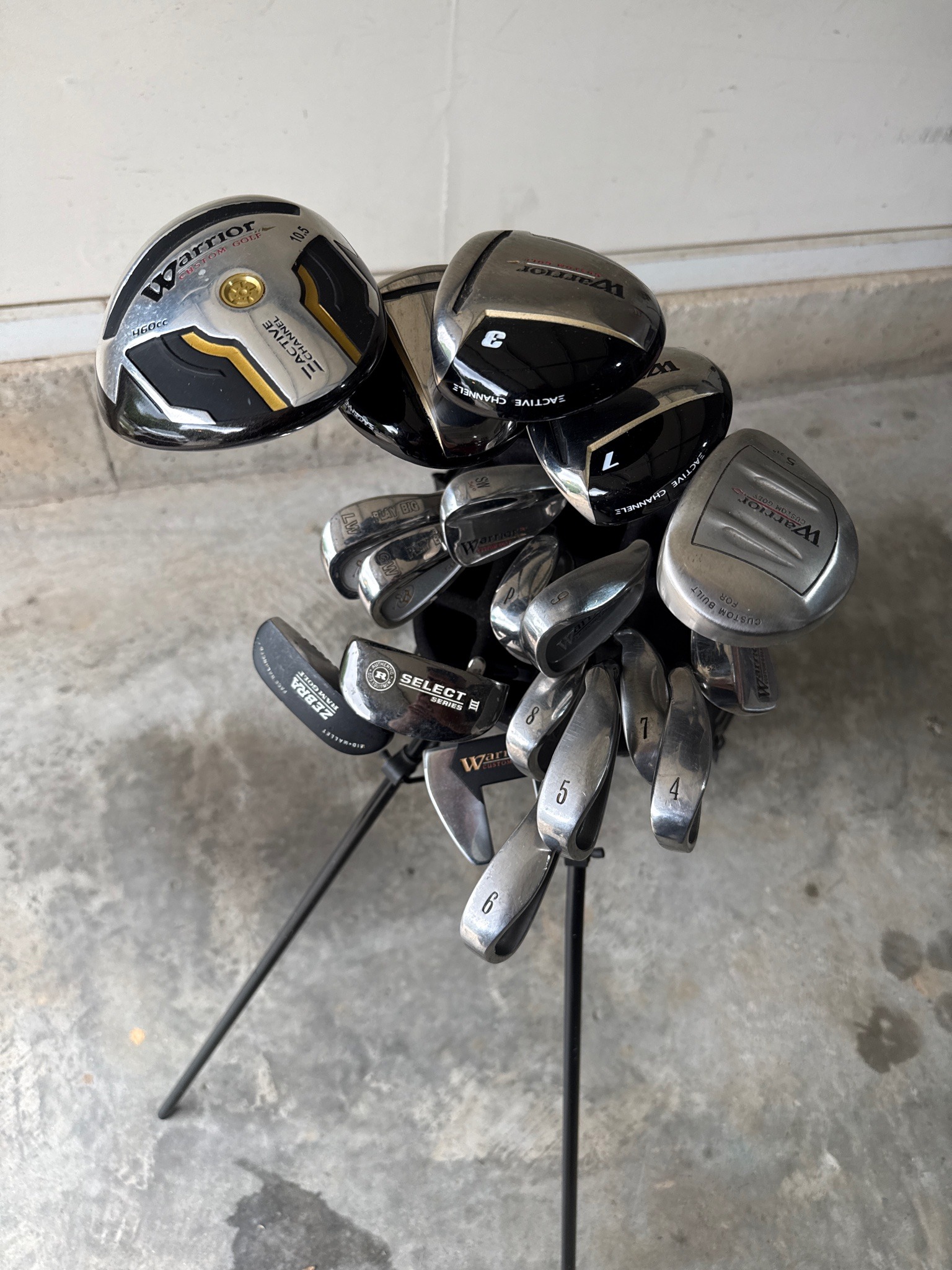 This is a comprehensive set of right-handed golf clubs predominantly manufactured by Warrior Custom Golf. The set includes a 460cc Driver with a 10.5-degree loft featuring 'Active Channel' technology, and multiple fairway woods including a 3-wood and 7-wood. The iron set appears to be a mixed cavity-back design including numbers 4, 5, 6, 7, 8, and specialty wedges marked 'GW' (Gap Wedge) and 'LW' (Lob Wedge). A notable addition is a Ram Golf Zebra 'Mid-Mallet' putter alongside a 'Select Series III' mallet putter. The clubs are constructed from stainless steel and titanium alloys with composite and steel shafts. This specific brand, Warrior Custom Golf, was prominent in the early to mid-2000s, known for direct-to-consumer marketing. The condition of the set is fair to good, showing visible signs of regular use including 'chatter' marks on the iron soles, minor scratching on the driver face, and some wear on the club heads. The clubs are housed in a black lightweight stand bag with integrated legs for upright positioning on the course. Craftsmanship is typical of mass-produced, entry-to-mid-level consumer golf equipment from the 2010 era.