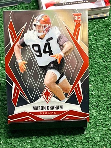 This is a modern collegiate or professional football trading card featuring Mason Graham of the Cleveland Browns. The card is part of the Panini Phoenix series, indicated by the 'Phoenix' stylized fire logo at the bottom center. The card displays Graham in a white Cleveland Browns jersey with the number 94, an orange helmet, and orange gloves, captured in an action pose. A prominent 'RC' logo in the top right corner signifies its status as a Rookie Card. The design features a heavy geometric aesthetic with red crystalline shapes bordering a dark grey diamond-patterned background. The card is standard size (2.5 by 3.5 inches) and appears to have a chrome or metallic finish typical of the Phoenix brand, which provides a reflective surface. The card's edges seem mostly sharp, though there is a minor white speck on the top left edge which may indicate slight corner wear or a surface blemish. The centering appears slightly heavy toward the bottom. The printing quality is high, with crisp text displaying the player's name and team in a bold sans-serif font. No major creases or scratches are visible in the current photograph.