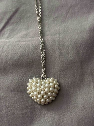 This jewelry piece consists of a silver-toned cable chain featuring a prominent heart-shaped pendant. The pendant is constructed using a three-dimensional cluster technique where numerous round, creamy-white faux pearls of varying sizes are closely set together to form a textured heart silhouette. The faux pearls exhibit a soft luster, though their consistent shape and surface suggest they are synthetic or glass-based with a pearlescent coating. The pendant is suspended from a simple circular jump ring attached to a machine-made metal chain, which appears to be stainless steel or silver-plated based on its cool, slightly greyish metallic tone. The overall construction suggests a contemporary fashion or costume jewelry origin, likely from the late 20th or early 21st century. The condition appears to be fair to good; there are no visible missing pearls, but the metal chain shows mild tangling and minor surface oxidation typical of non-precious metals. The craftsmanship indicates mass-market production rather than artisan jewelry, evidenced by the uniform machine links of the chain and the visible metal infrastructure holding the pearls in place. It lacks any visible designer hallmarks or purity stamps in the provided view.